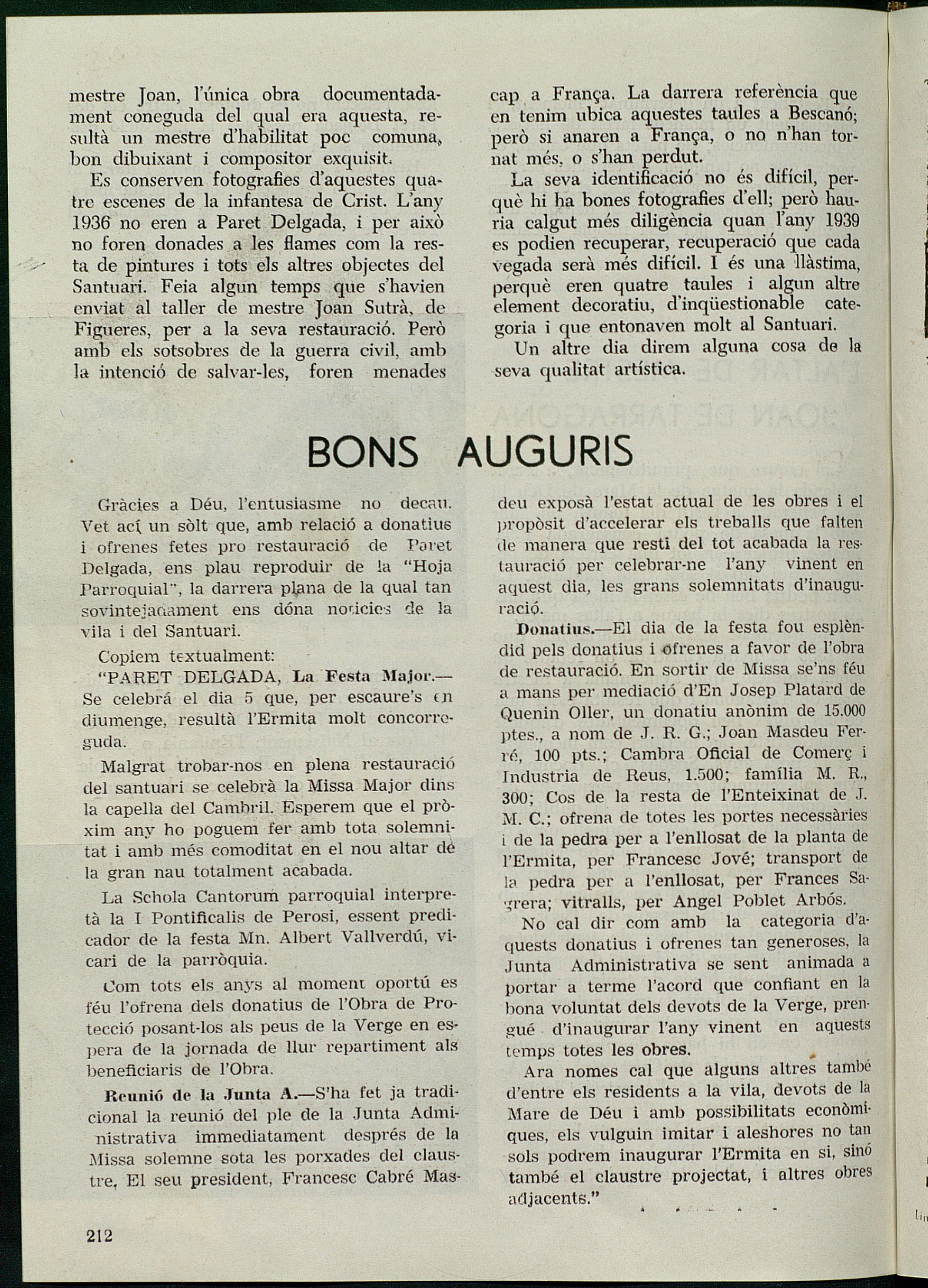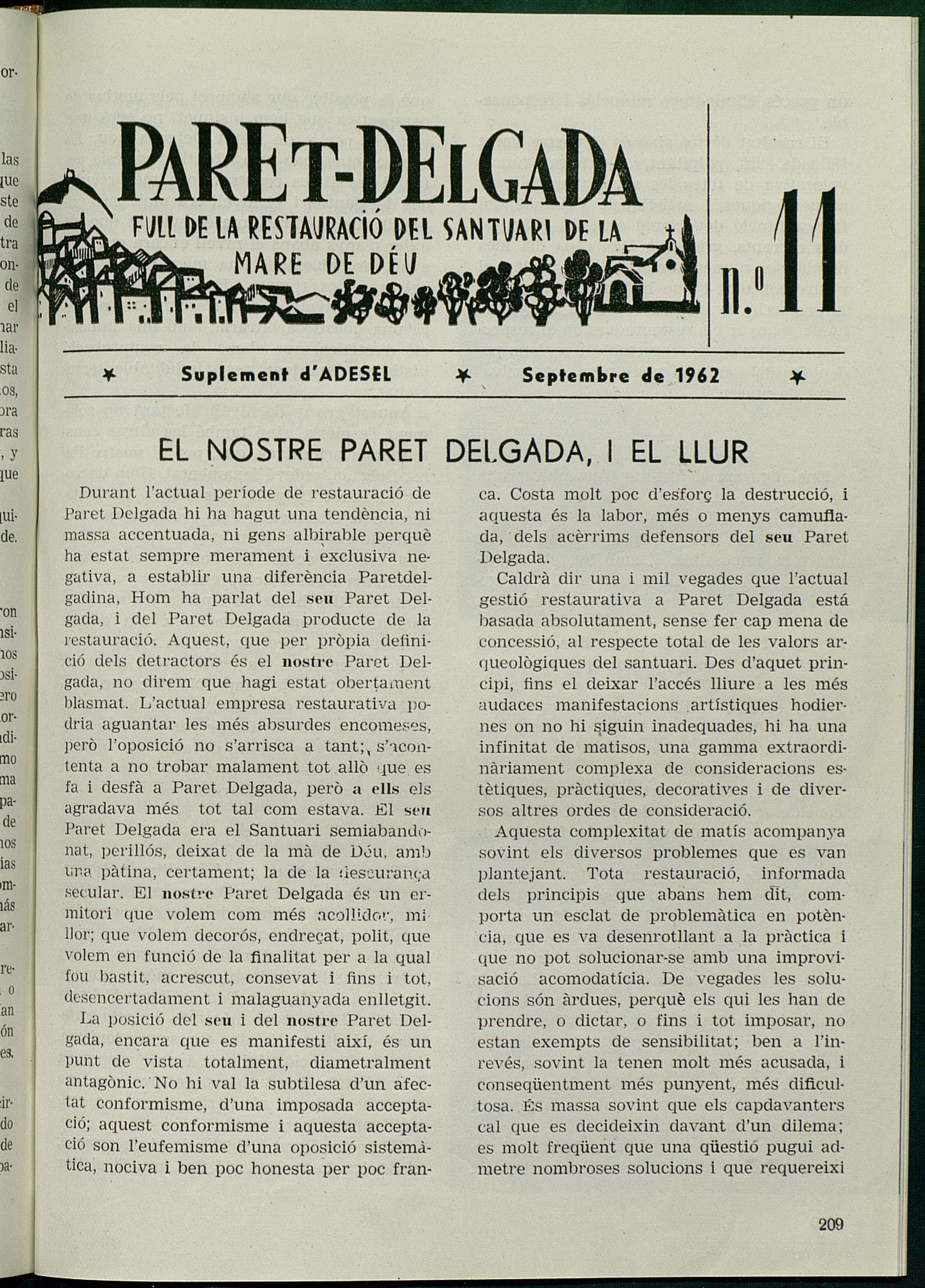 Onzè suplement de la circular d’ADESEL sobre la restauració de Paret-Delgada publicat per l’Agrupació de Selvatans residents fora de vila. Fou publicat el setembre de 1962.