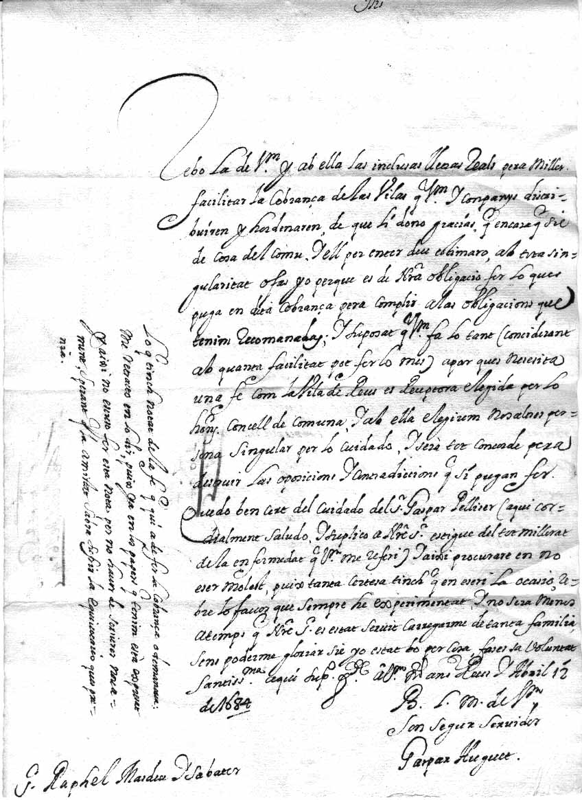 Carta adreçada per Gaspar Huguet de Reus a Rafel Masdeu