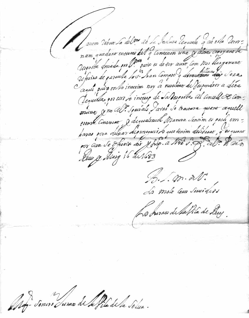 Carta adreçada pels jurats de Reus als de La Selva. S’esmenta la rebuda d’una requesta i la necessitat que el tema sigui tractat en Consell de Comuna;