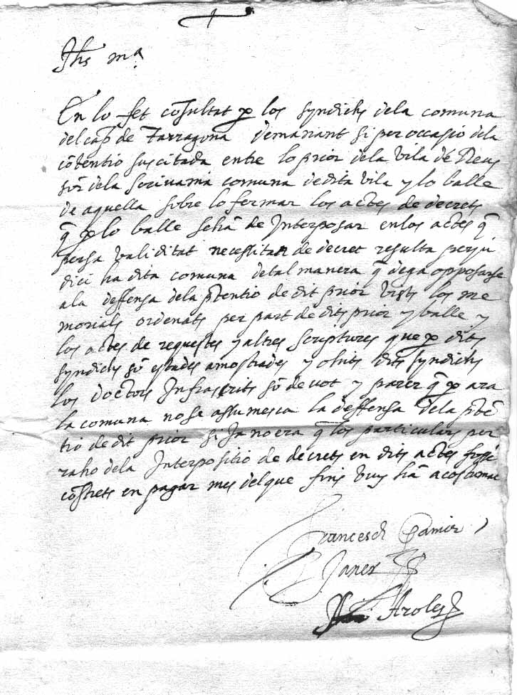 Francesc Pamies i A. Aroles, advocats, donen el seu parer a una consulta feta pels síndics de la Comuna sobre una causa que mantenien el prior de Reus i el batlle de Reus. La naturalesa del contenciós era sobre la facultad del batlle de signar els actes de decrets.